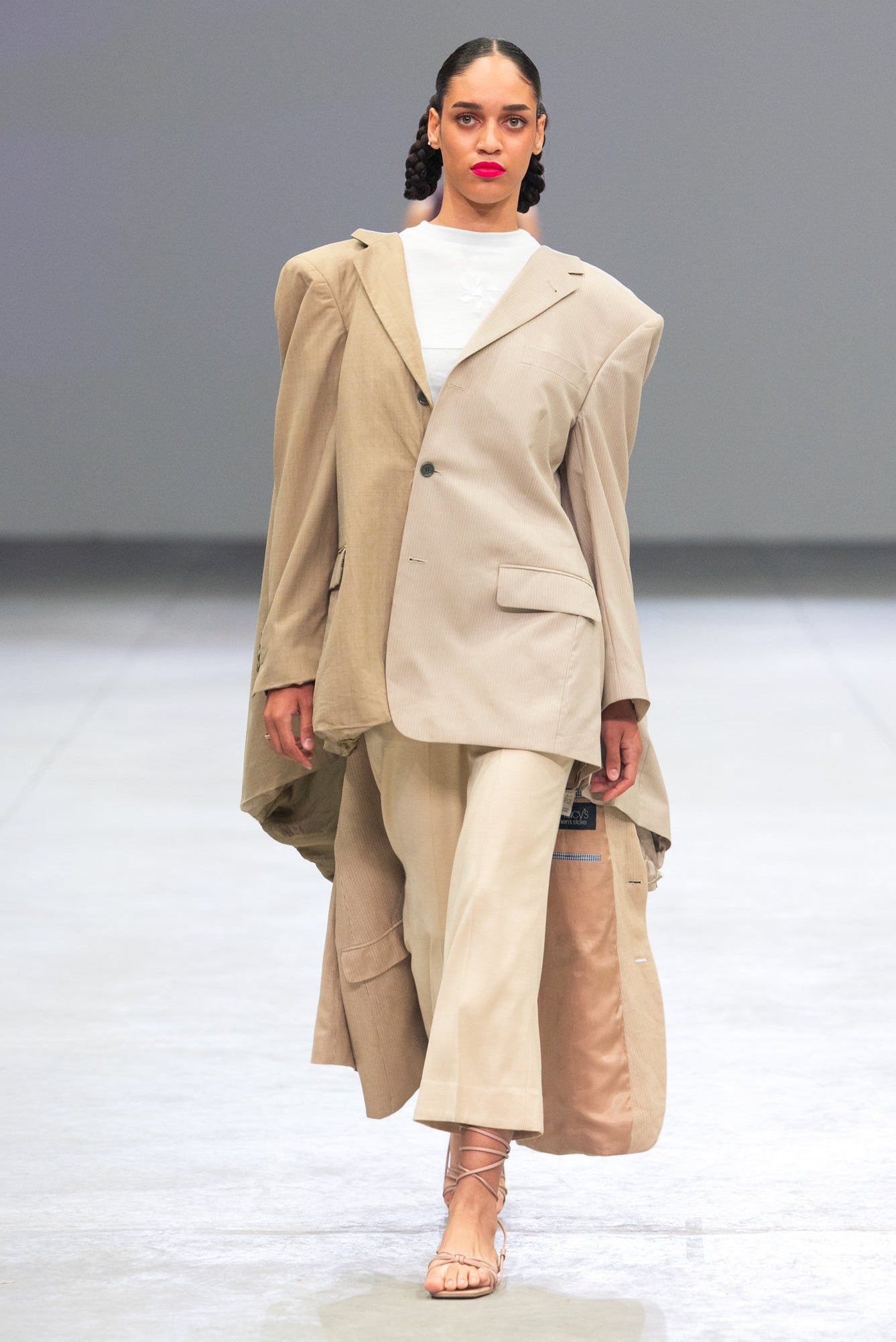 Inspired by natural mutation, it combines trousers, skirts and recycled tailoring into a single modular structure that evolves with the wearer.