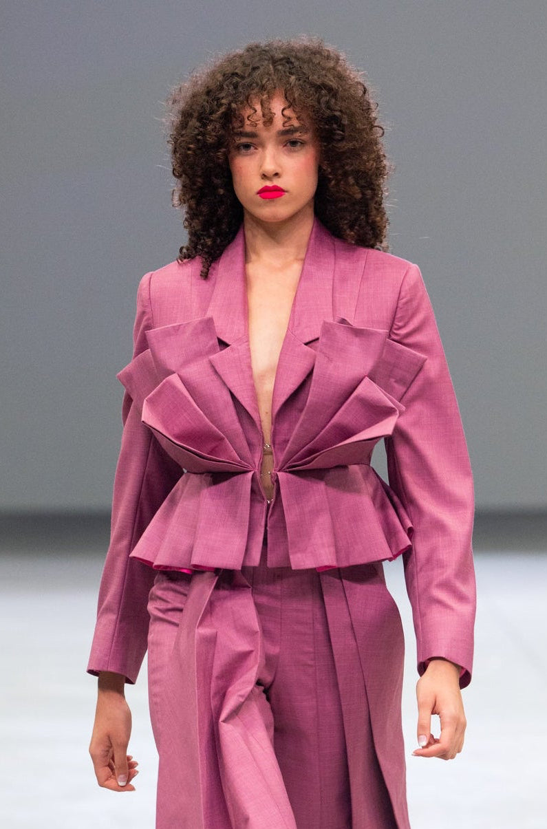 Made from mauve twill , its design features three-dimensional structural pleats at the front and waist, creating an expansion effect reminiscent of the unfolding of a flower or a growing organism.