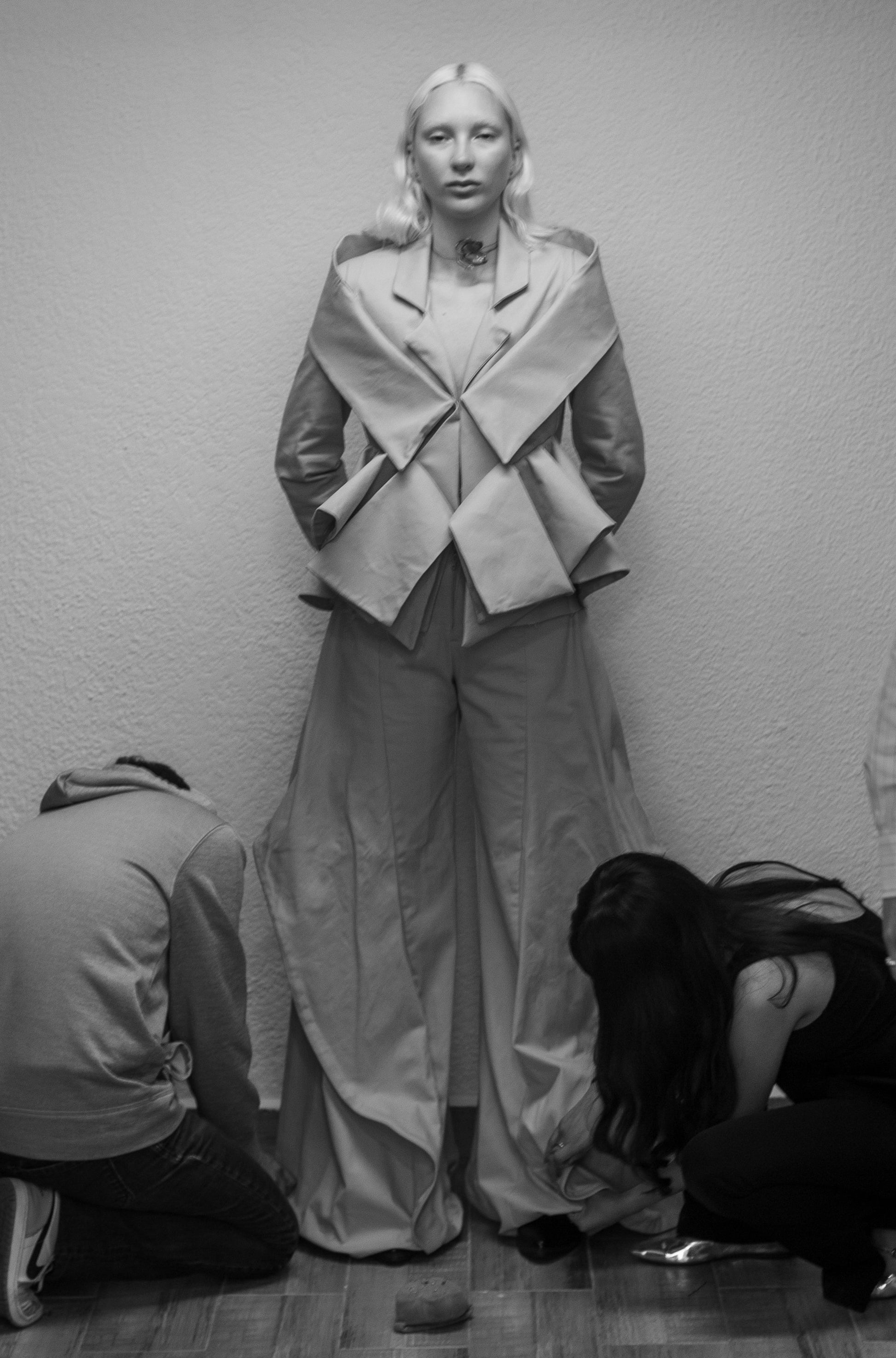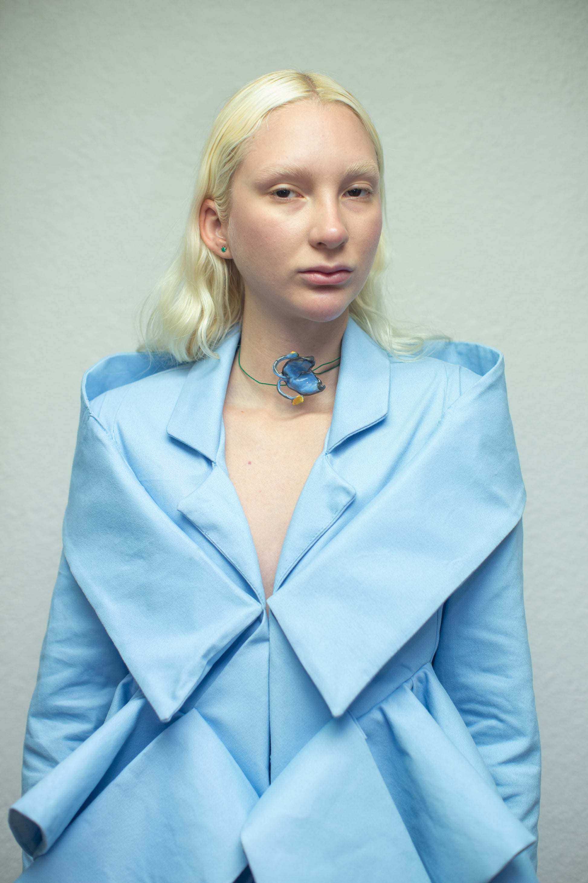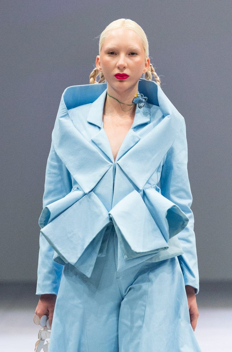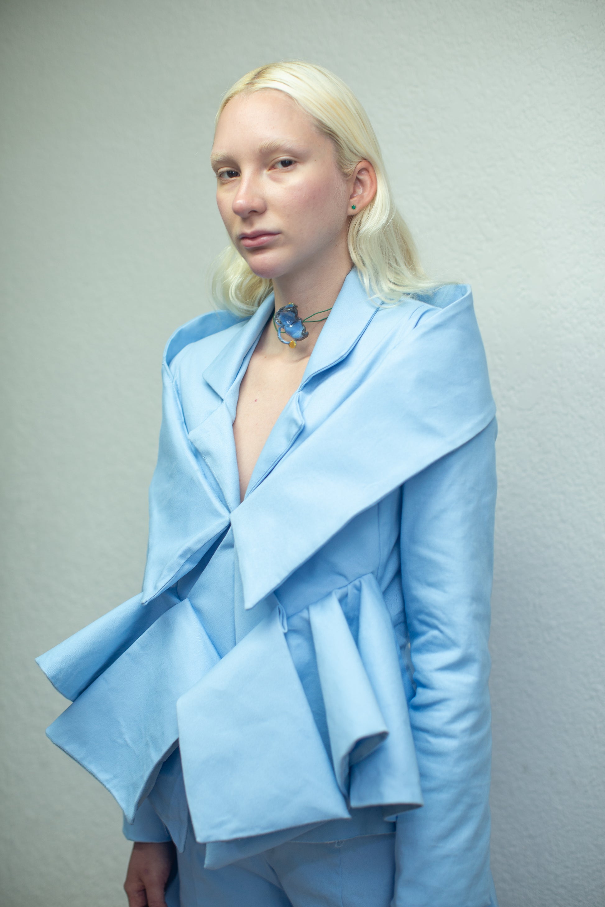 The Caelus Sack elevates tailoring to its most ethereal form. Inspired by celestial beetles and nature's protective structures, this piece combines technical precision with a sense of architectural lightness.