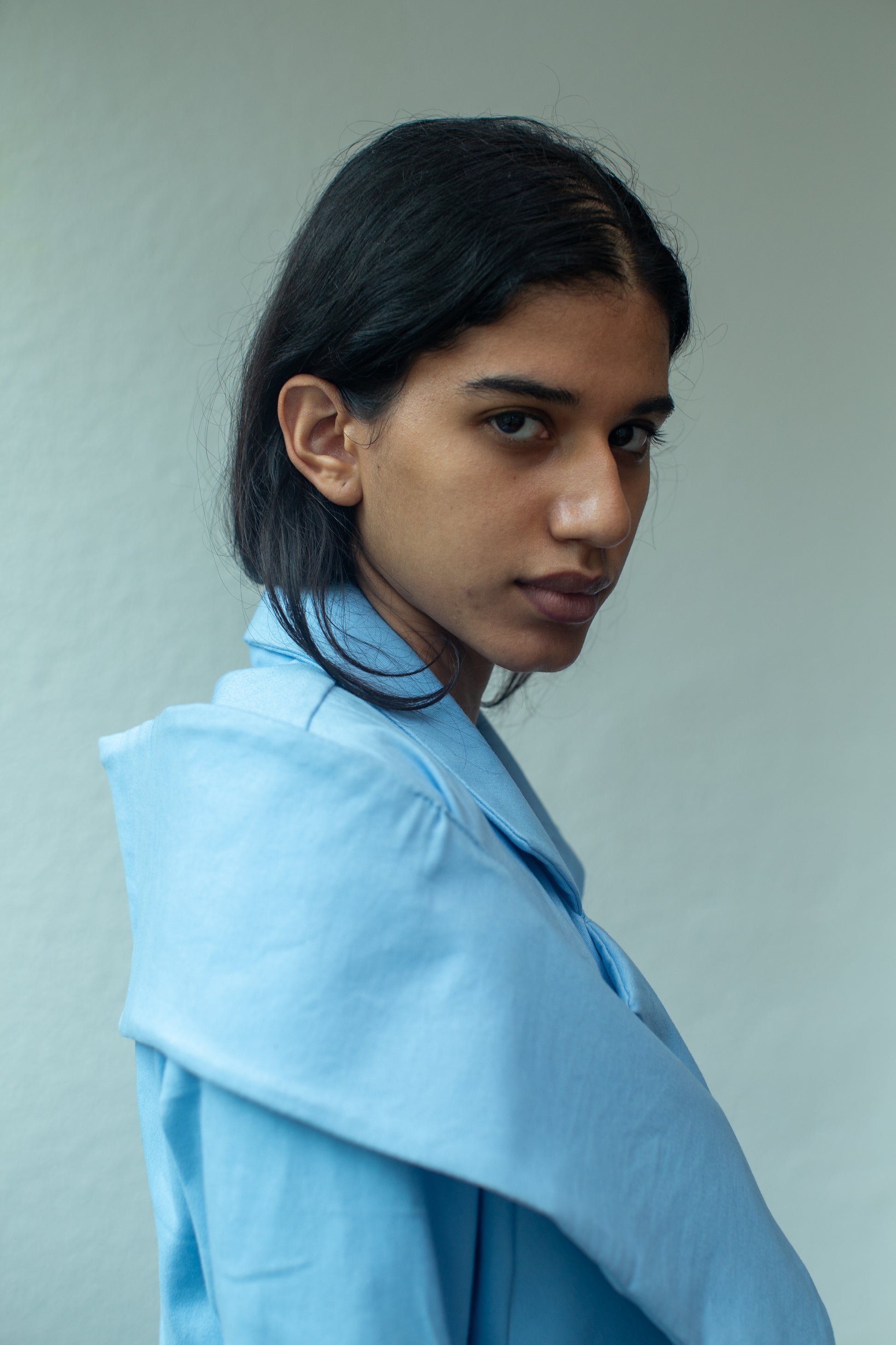 Made from sky blue stretch gabardine , its structure allows freedom of movement without losing its shape.