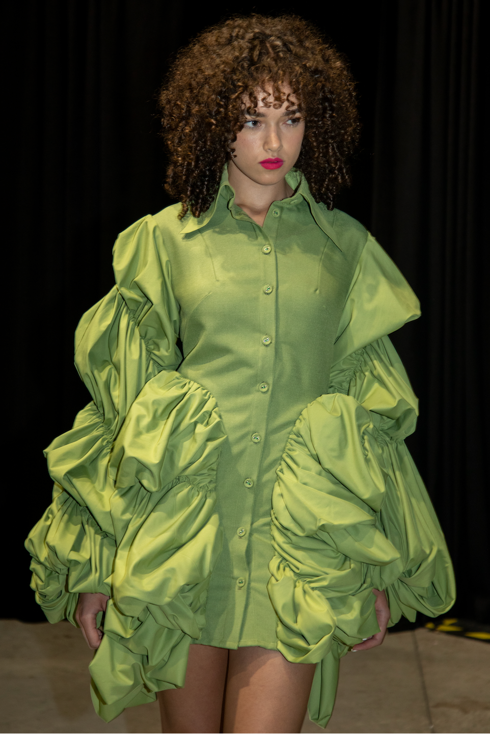 Made from apple green gabardine for the body and lightweight poplin for the sleeves , this piece plays with the contrast between rigidity and movement.