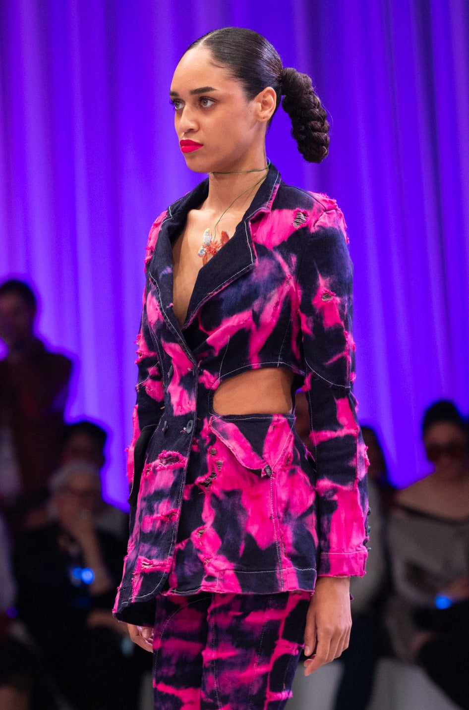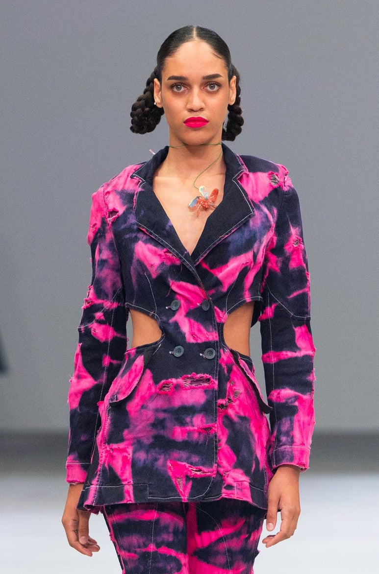 Made from certified organic denim, it is a piece of experimental tailoring , vibrant and unique.