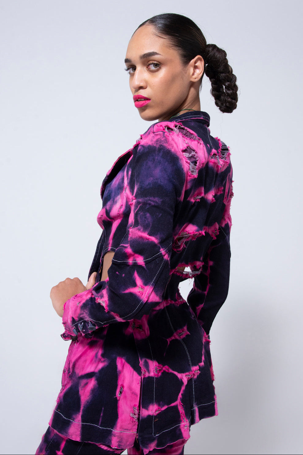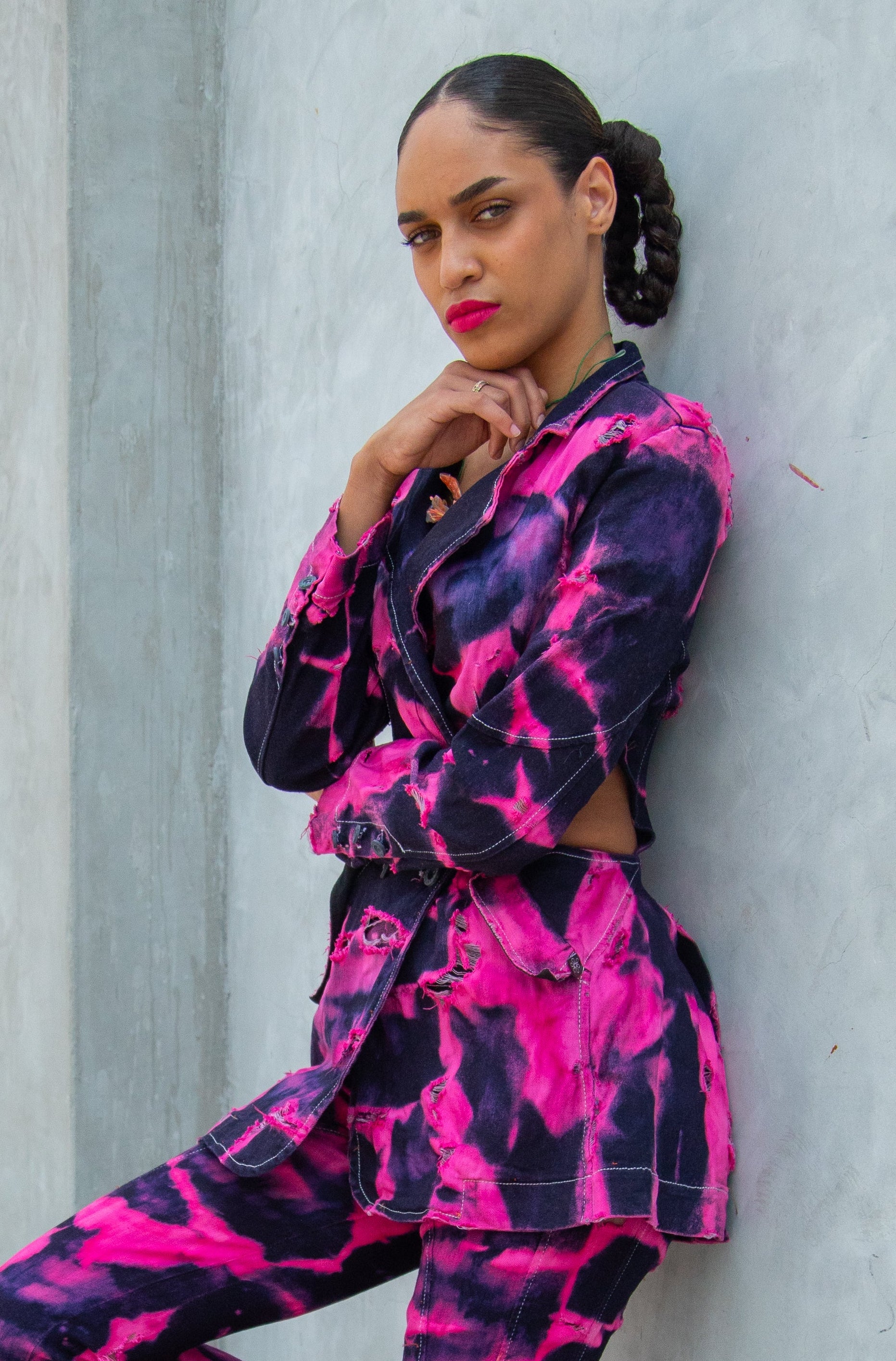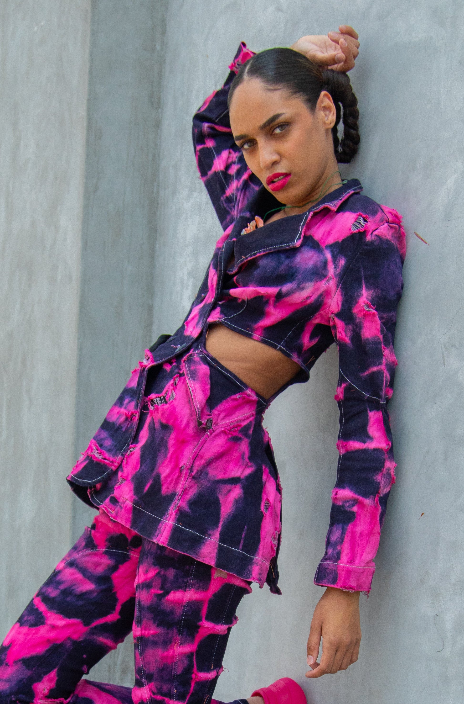 Each piece is hand-dyed in shades of Mexican pink on OEKO-TEX and Bluesign certified organic denim , evoking the petals of the bougainvillea, a symbol of resilience and natural beauty that finds its way through walls.