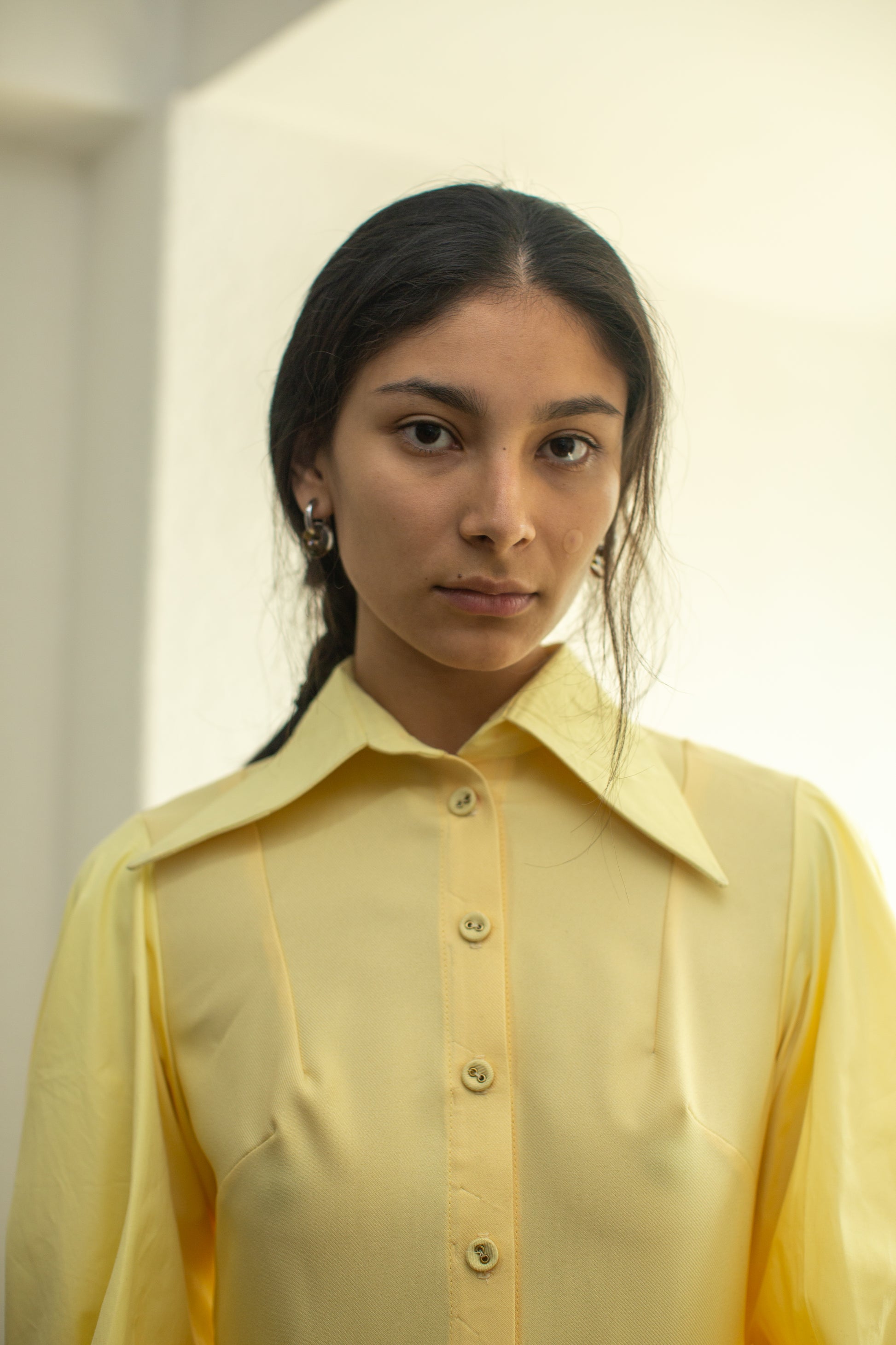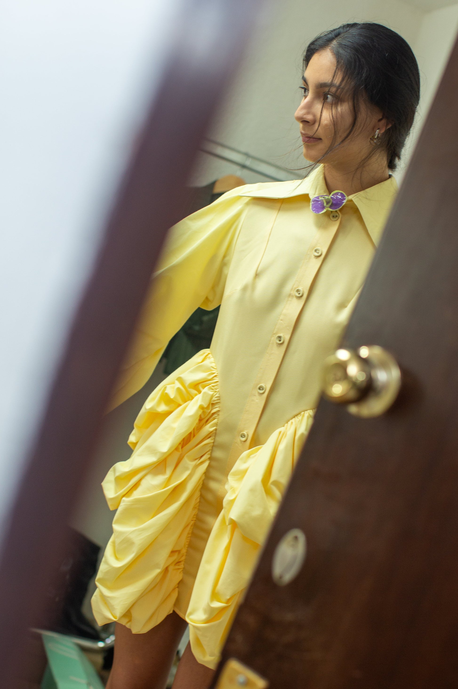 Crafted from butter-yellow gabardine and poplin , the structured body is balanced by spirally gathered sleeves that expand the volume outwards, like a flower in full bloom.