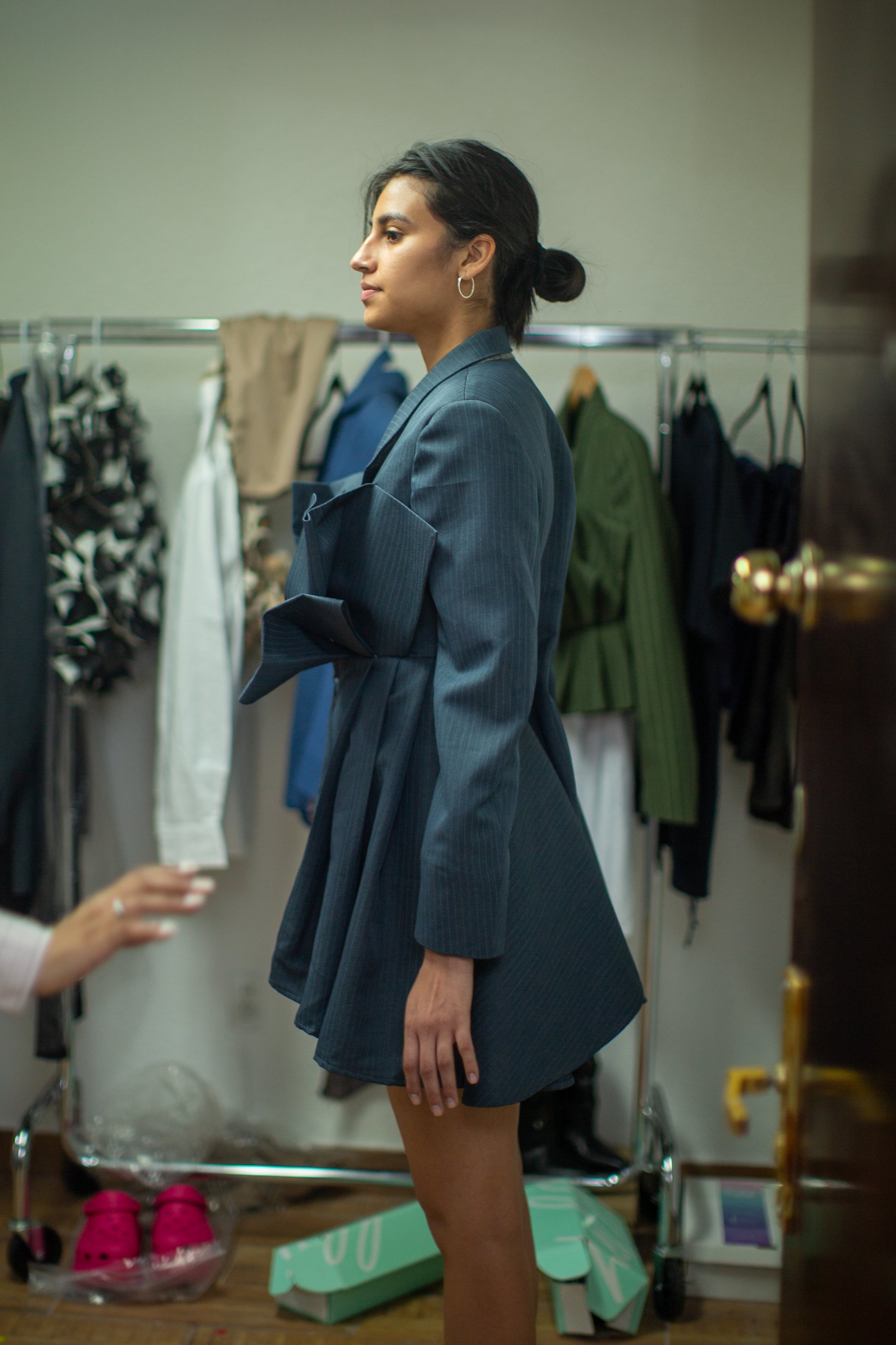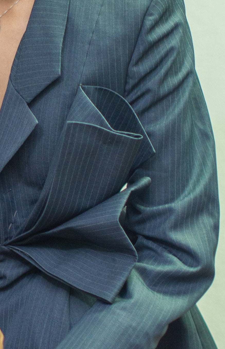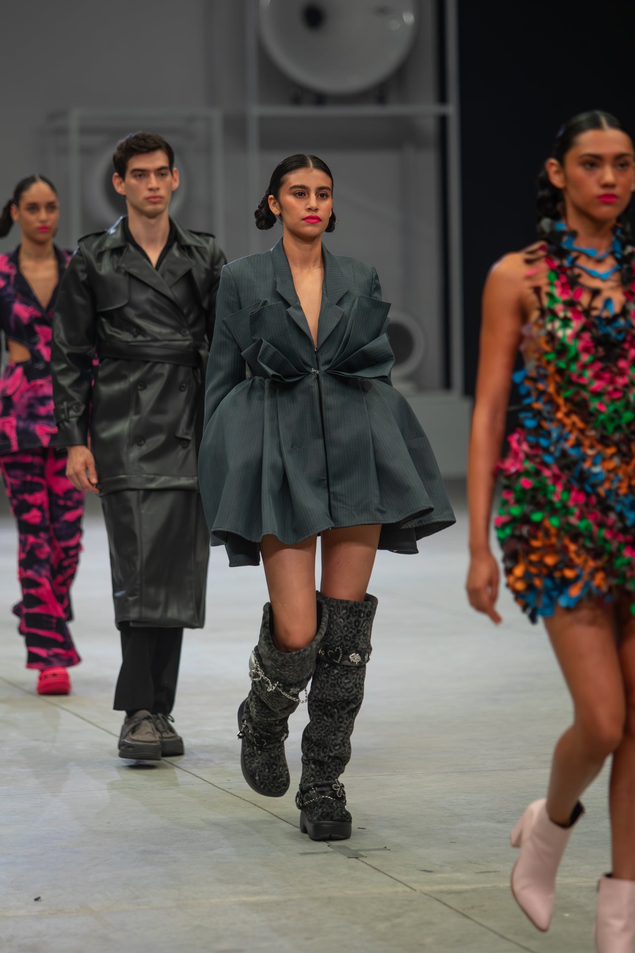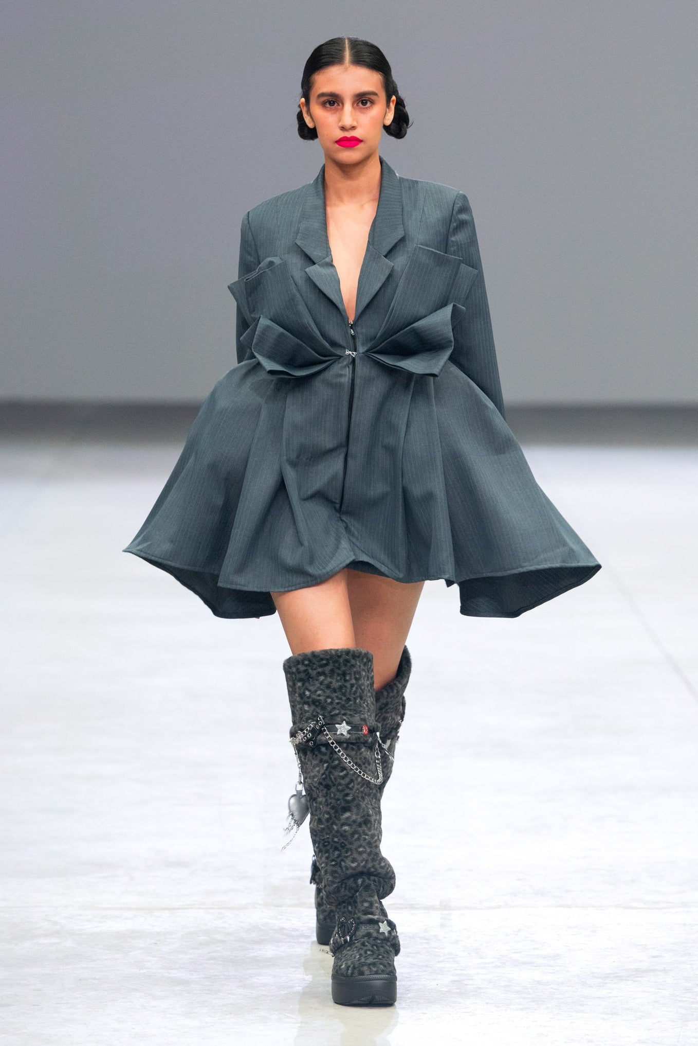 The skirt's movement creates controlled motion, transforming the rigidity of tailoring into a lively and natural gesture.