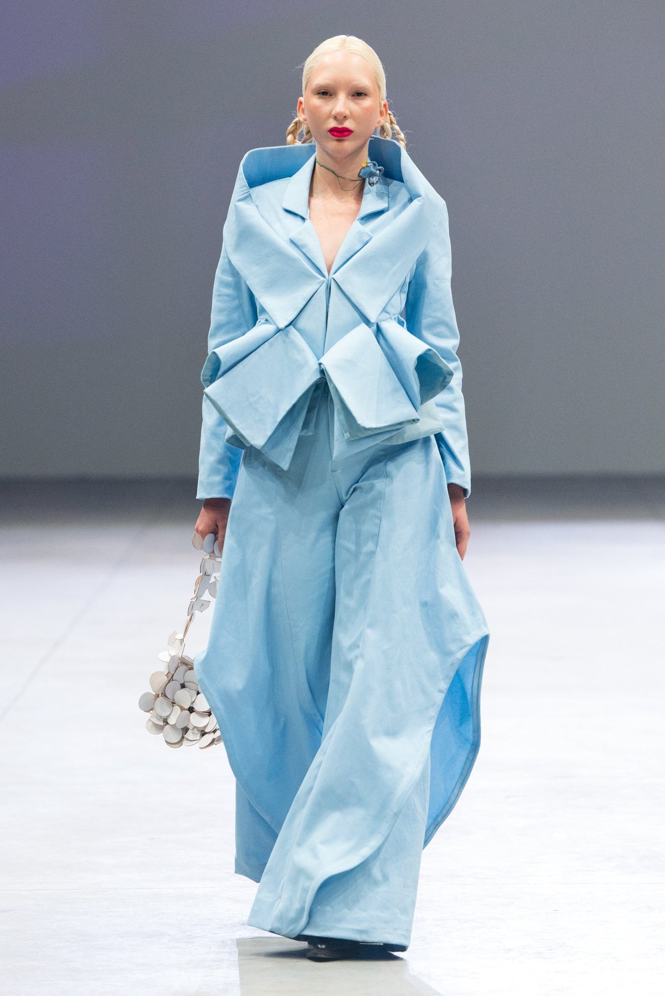 Hecho en gabardina stretch azul cielo, ofrece elasticidad controlada y cuerpo firme, creando una silueta arquitectónica que se adapta al movimiento humano.
