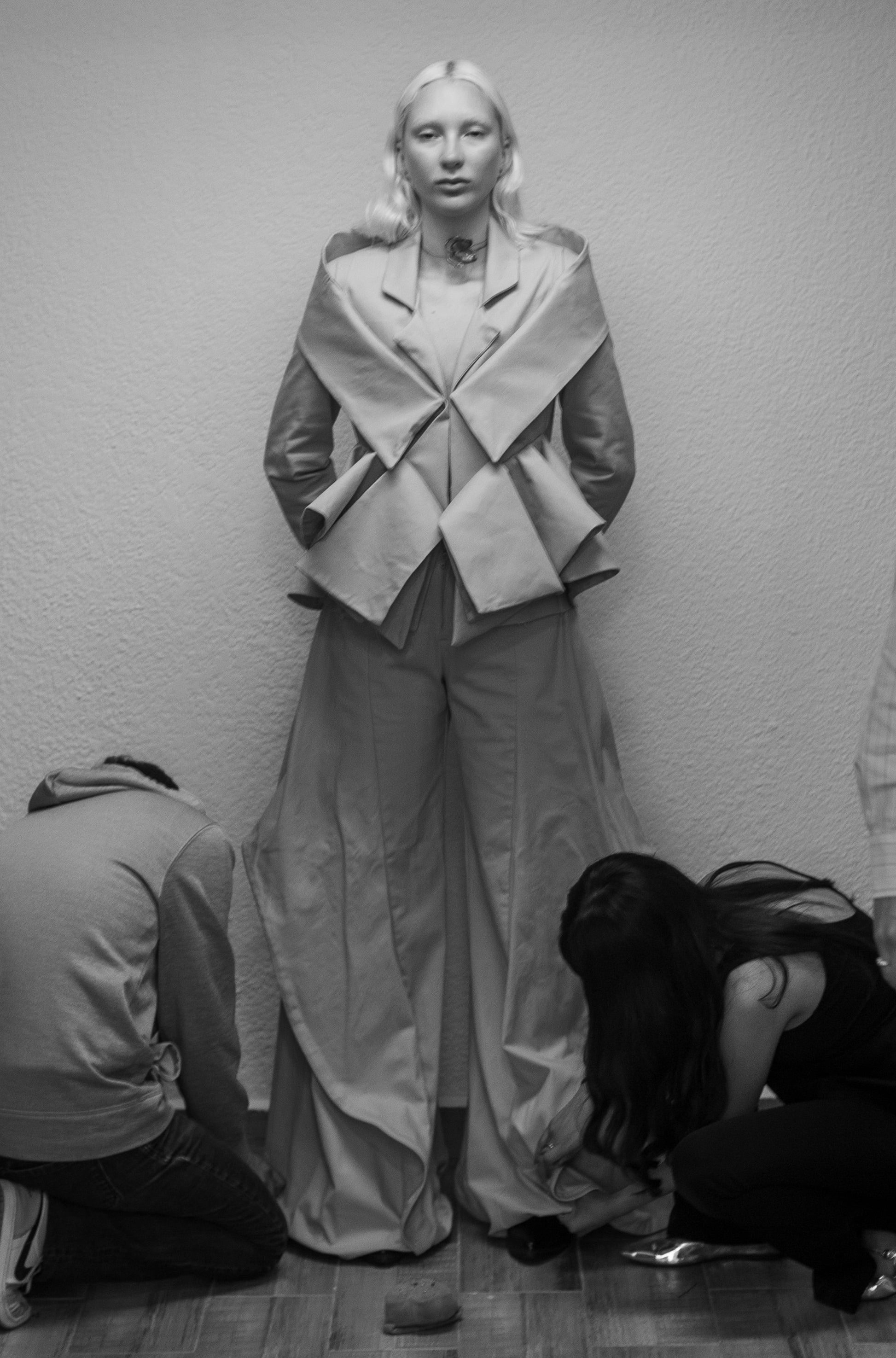 Su diseño escultórico de pliegues fluidos y caída amplia refleja el movimiento de las alas en vuelo, un equilibrio entre estructura y libertad.