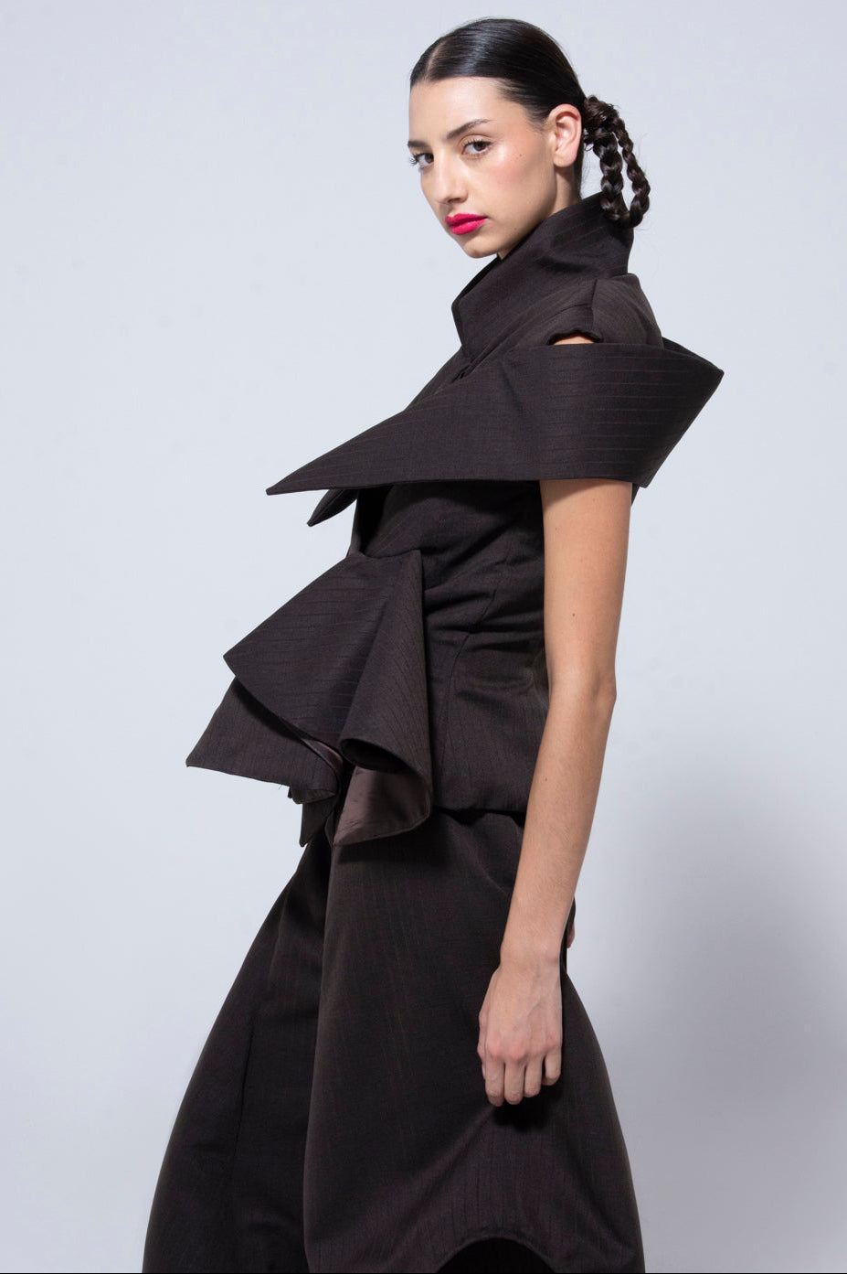 Confeccionado en sarga sastre café oscuro con líneas finas, este pantalón une la elegancia del tailoring con la experimentación escultórica característica de EUDAMONIA SS26.