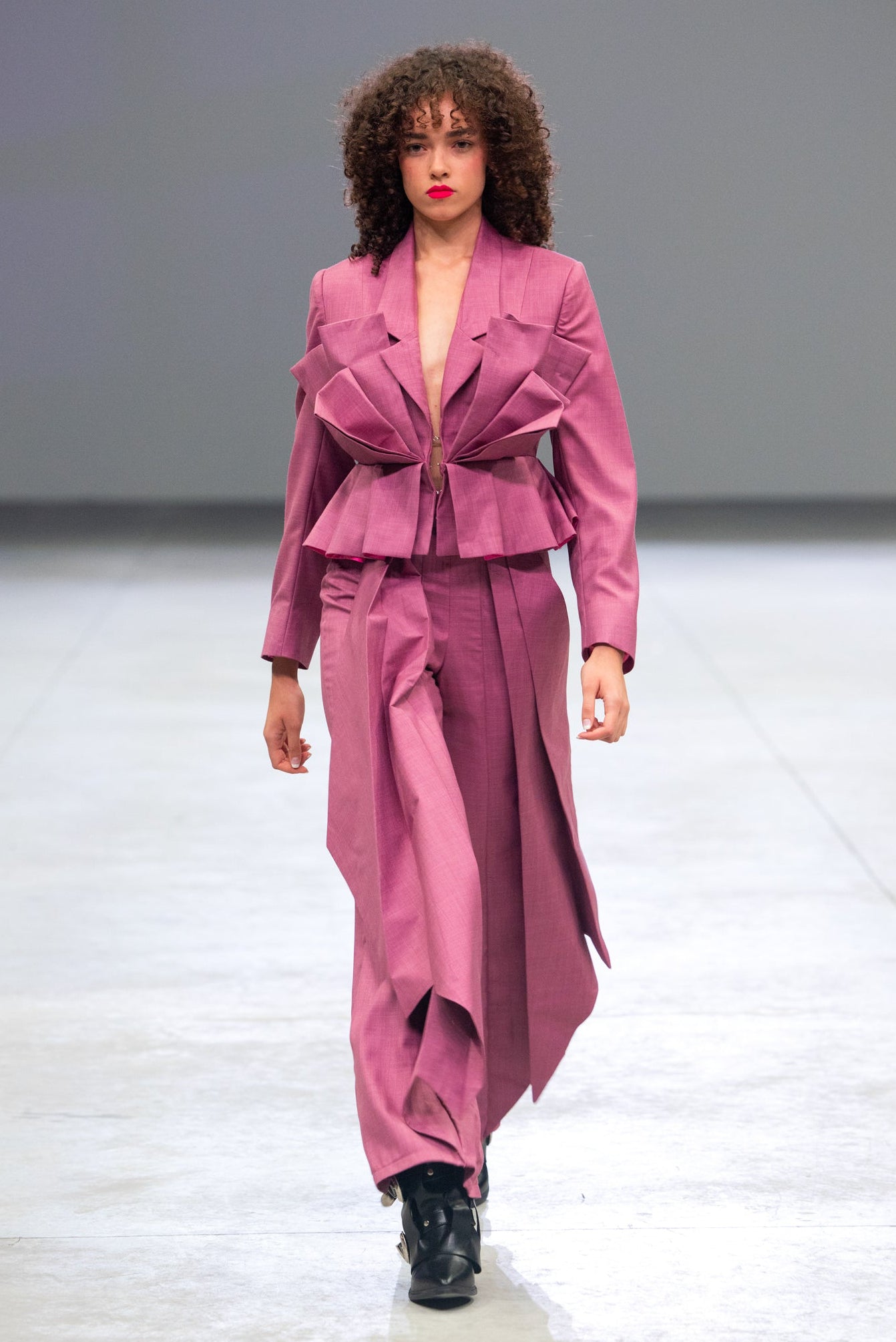 Confeccionado en sarga sastre color malva, presenta una silueta estructurada con pliegues verticales que se abren en forma helicoidal, creando movimiento con cada paso.
