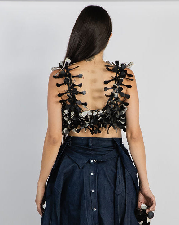 La inspiración detrás de esta prenda es el biomimetismo: el diseño de siluetas propositivas y textiles innovadores basados en el estudio de distintas especies de animales y plantas. Este top es parte de la colección Eudamonia, presentada en London Graduate Fashion Week.
